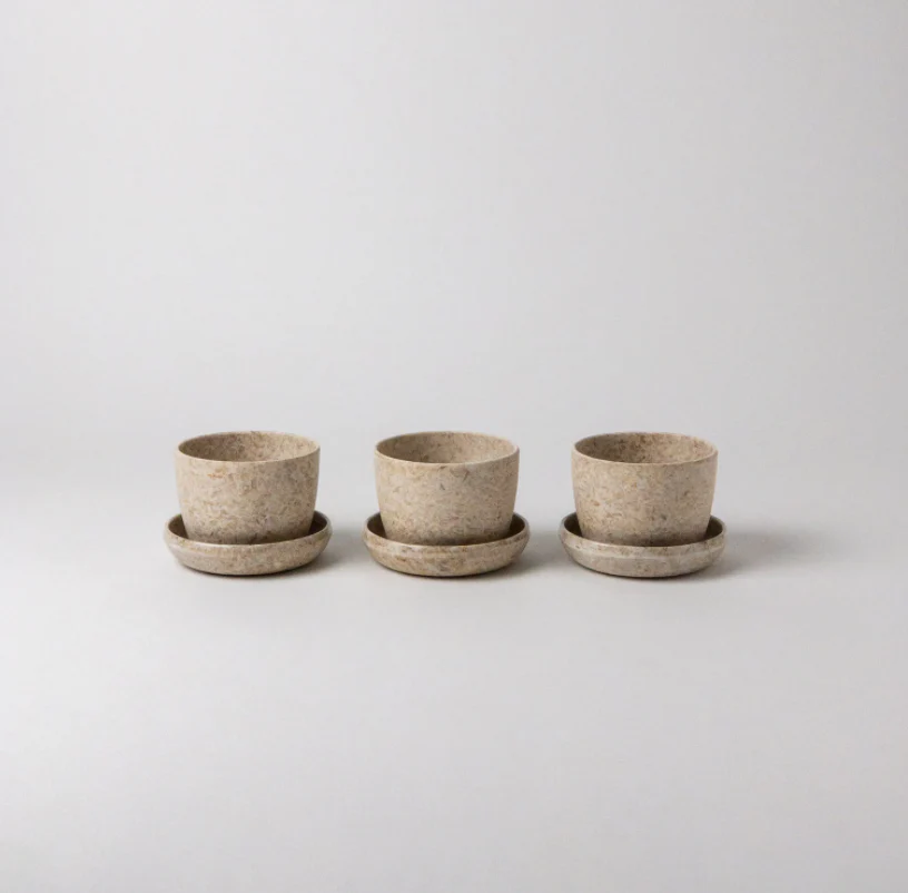 These elemental tone mini planters are ideal for 2" nursery plants & succulents. The compact size is excellent for limited-spaces such as bedrooms, desks, coffee tables, and offices. Each pot with its unique natural tone makes an eye-catching statement piece as a set while blending with any colour scheme. The durable and natural-looking plant container has been transformed from agricultural by-products and waste materials. Equipped with a drainage hole with a saucer, this mini pot is a perfect starter for plant beginners. **Plant not included** Planter Measurements: 3in Width x 2.25in Height (3in Opening Diameter | 2.25in Bottom Diameter) Dish Measurements: 3.5in Width x 0.75in Height